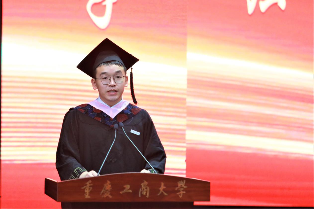时代造就青年,盛世成就青年。2019级本科生钱世淋作为学生代表发表了毕业感言。他回顾了在pp电子平台官网入口四年的成长与收获,向辛勤培育他的母校、领导和老师表达了最真挚的祝福与感谢。他谈到,毕业生们即将拾起行囊整装启程迈向人生新阶段,以校友的身份在世界各地、祖国南北不同领域里奋斗。他表示,全体毕业生将牢记“厚德博学,求是创新”的校训,永葆“含弘自强,经邦济民”的重工商大精神,在各自的青春赛道跑出无愧于母校、无愧于祖国、无愧于人民、无愧于这个时代的好成绩,在以中国式现代化全面推进中华民族伟大复兴的新征程上贡献重工商大人的力量。