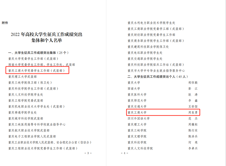 近日,重庆市教育委员会发布《关于2022年普通高校学生管理工作成绩突出集体和个人的通报》(渝教学函〔2023〕14号)和《关于2022年高校大学生征兵工作成绩突出集体和个人的通报》(渝教学函〔2023〕19号)。pp电子学生处获评“学生日常管理工作成绩突出集体”,白文静同志获评“学生日常管理工作成绩突出个人”;党委学工部(武装部)获评“大学生征兵工作成绩突出集体”,周良勇同志获评“大学生征兵工作成绩突出个人”。