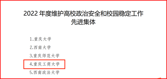近日,重庆市教育委员会和重庆市公安局联合印发《重庆市教育委员会重庆市公安局关于2022年度维护高校政治安全和校园稳定工作先进集体和先进个人的通报》(渝教安函〔2023〕38号),pp电子荣获“2022年度维护高校政治安全和校园稳定工作先进集体”荣誉称号。这是自2014年以来,pp电子安全稳定工作连续获得的第9个先进集体荣誉称号。同时,4位同志荣获“2022年度维护高校政治安全和校园稳定工作先进个人”荣誉称号。