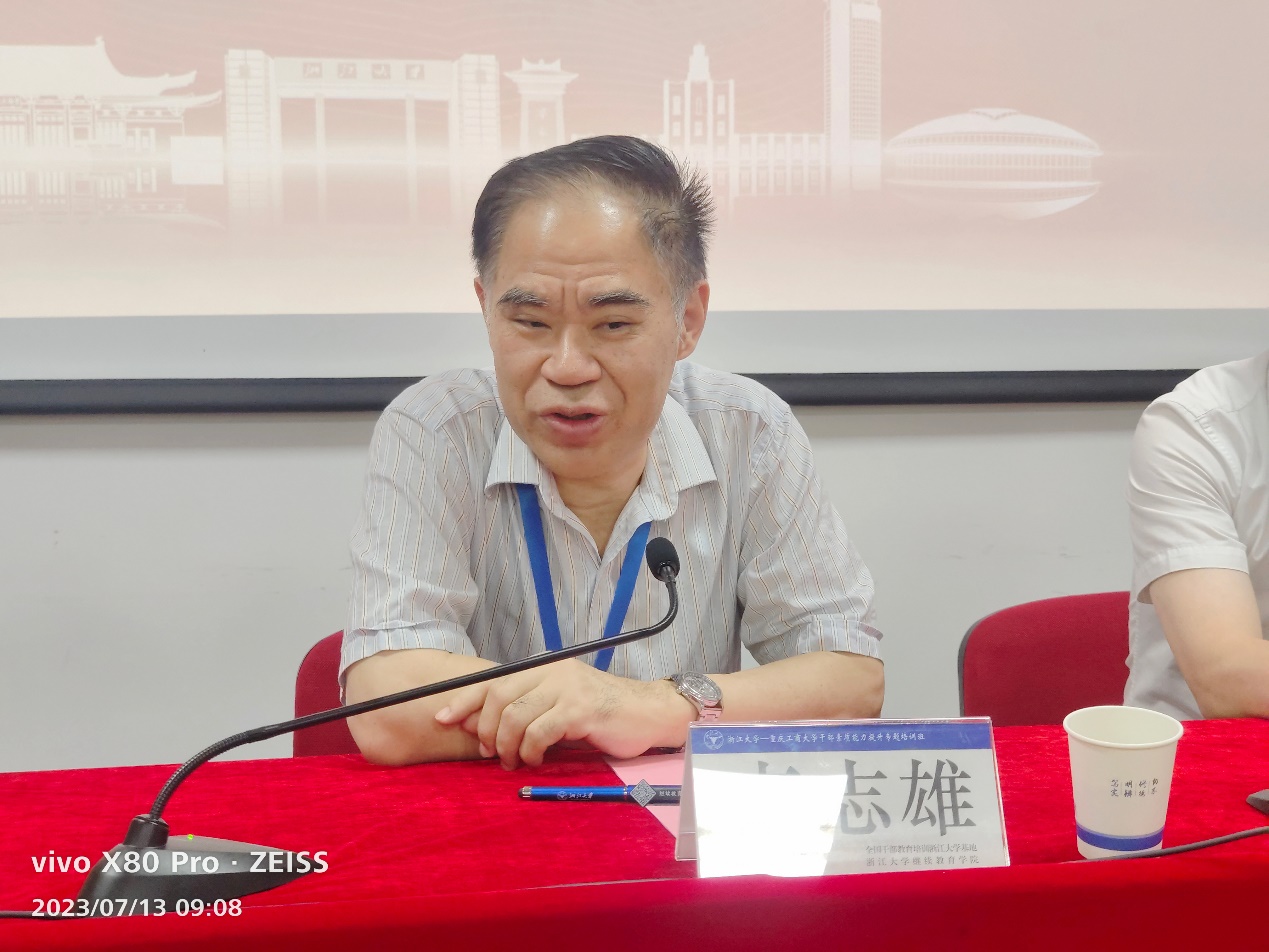 7月13日上午,培训班开班式在浙江大学华家池校区举行,全国干部教育培训浙江大学基地副主任、浙江大学继续教育学院党委副书记兼副院长钟永萍,pp电子党委书记李志雄出席开班式。