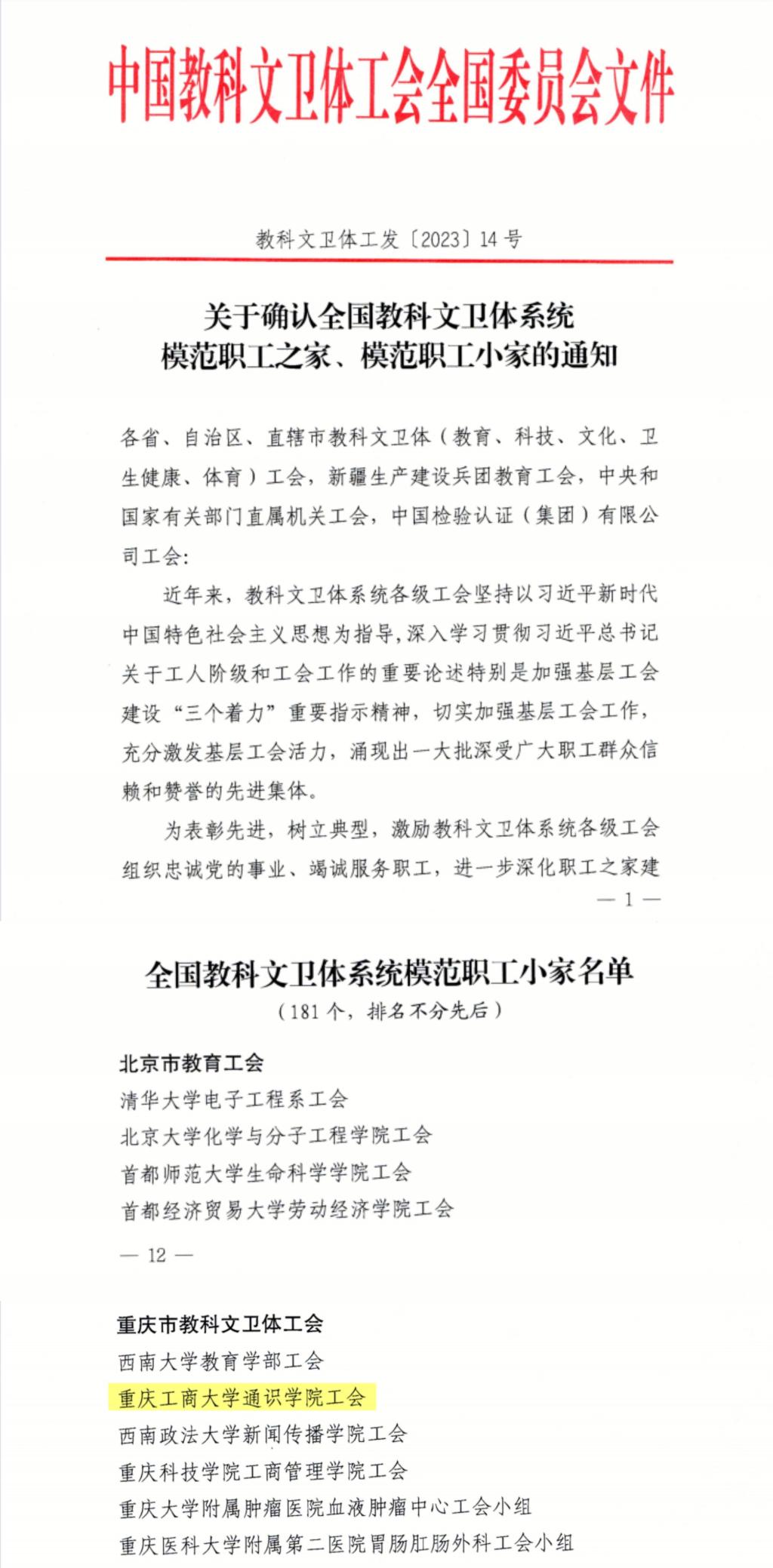 同时,重庆市教科文卫体工会委员会发布《关于2023年先进职工之家(小家)创建结果的通报》,pp电子工商管理学院工会、机关工会第七分工会、机关工会第八分工会、机关工会第十五分工会四家职工小家荣获重庆市教科文卫体工会系统先进职工小家荣誉称号。