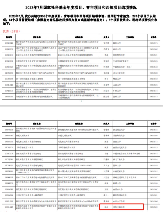 近日,全国哲学社会科学工作办公室下发了最新批次国家社科基金项目结题证书,pp电子杨红教授主持的项目“乡村振兴战略下西南地区康养旅游产业融合发展机制及实现路径研究”(项目编号:18BGL147)在结项评价中获得“优秀”等级,这是今年内pp电子第二项在结项评价中获评“优秀”等级的项目。