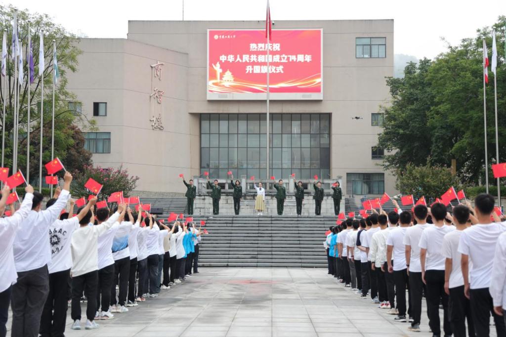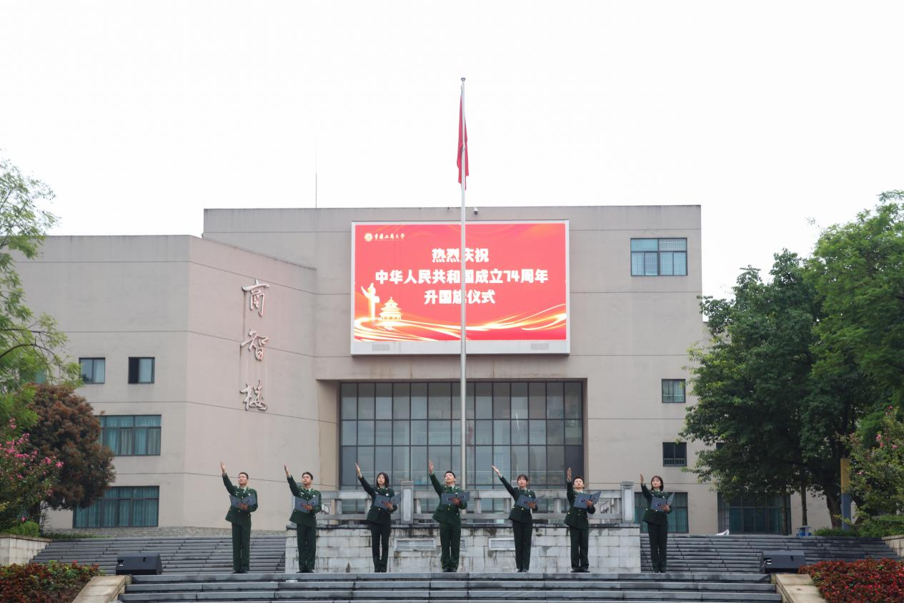 为庆祝中华人民共和国成立74周年,10月1日清晨,pp电子在含弘广场隆重举行国庆升旗仪式。