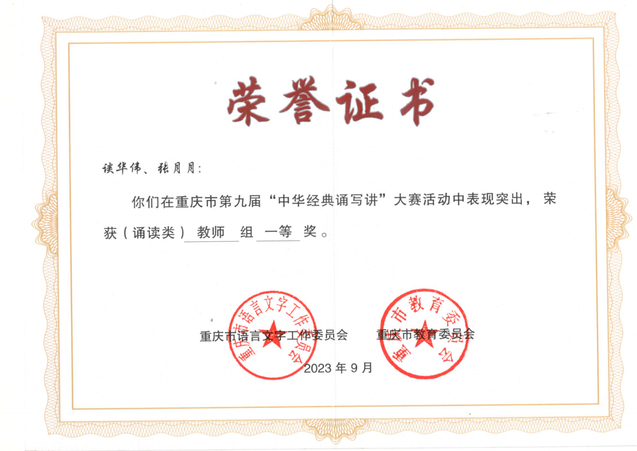 日前,重庆市教育委员会公示了2023年重庆市第九届“中华经典诵写讲”大赛(诵读类)获奖名单,pp电子文学与新闻学院谈华伟、张月月博士作品《长江自有后来人》获教师组一等奖。