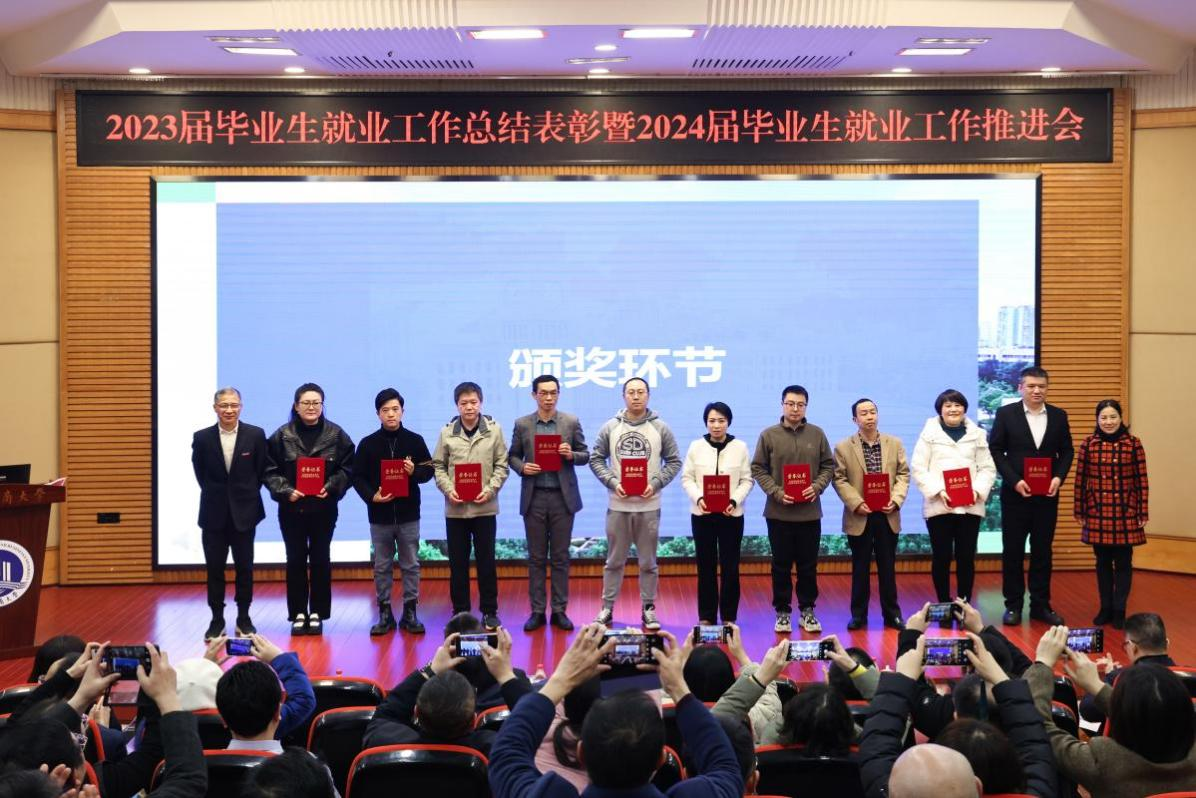陈运超宣读了pp电子平台官网入口《关于表彰2023届本科毕业生就业工作先进集体、优秀个人的决定》。陈运超、柏群为获得“就业工作优秀个人”的毕业班辅导员、就业工作联络员颁奖;李敬、张海燕为获得“就业工作优秀个人”的专任教师颁奖;温涛为获得“就业工作优秀个人”的中层干部颁奖;曾维伦为体育学院、环境与资源学院、金融学院、公共管理学院、经济学院、外国语学院6个荣获2023届本科毕业生就业工作先进集体的学院颁奖。