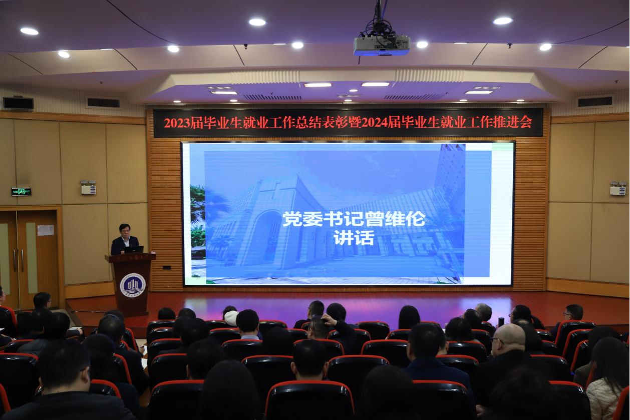 曾维伦在总结讲话中向获奖单位和个人表示祝贺,向过去一年奋战在就业工作战线的教职工们表示衷心感谢。他指出,做好毕业生就业工作,事关千家万户的家庭幸福和社会的稳定。全校上下要深入贯彻落实习近平总书记重要指示批示精神,落实落细党中央、国务院“稳就业”“保就业”决策部署,总结工作、分析形势,全面部署做好2024届毕业生就业工作。对此,他提出三点要求:一是要认清严峻形势,增强紧迫感。要深刻认识党的二十大报告中关于“就业是最基本的民生”的论述。不断增强做好就业工作的紧迫感,早谋划、早部署、早行动,加快推进就业工作进度;二是要抓住主要矛盾,抓实关键环节。要不断推进学科专业设置改革,推动人才供需动态平衡,联动学科专业调整与人才需求,建设适应现代化建设的人才培养体系,从而实现精准服务学生,精准服务企业;三是要创新体制机制,形成工作合力。要加强统筹协调,促进各方面工作有机统一,形成学校党政统一领导,招生就业处牵头协调,各部门协同配合,各学院抓好落实的健全工作体系和良好工作机制,形成强大工作合力,多措并举促进毕业生高质量充分就业。