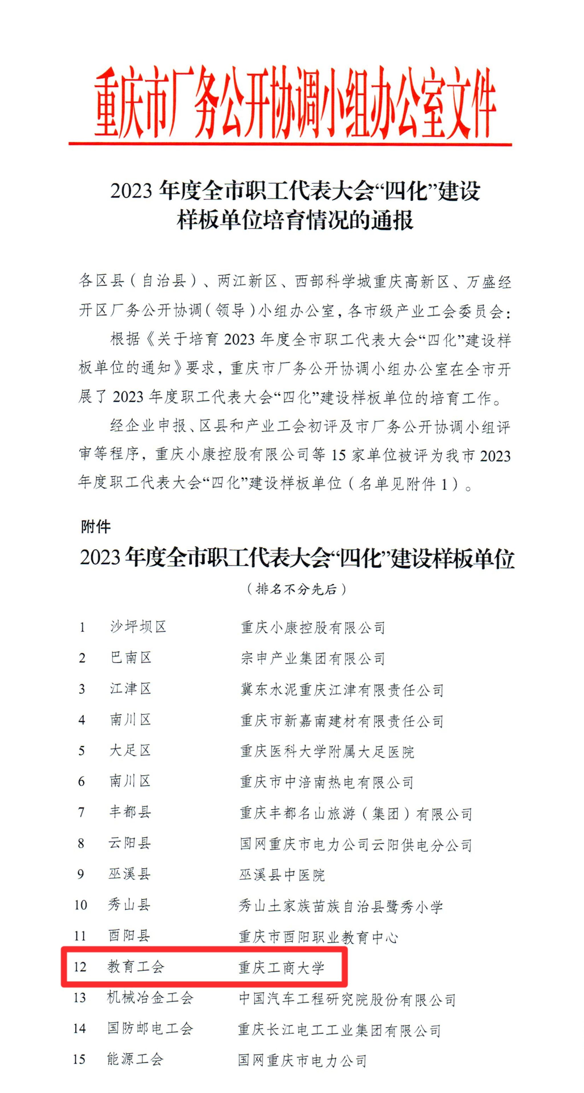 近日,收到重庆市厂务公开协调小组办公室文件《2023年度全市职工代表大会“四化”建设样板单位培育情况的通报》,pp电子被评为职工代表大会“四化”建设样板单位,为重庆市教科文卫体系统唯一样板单位。