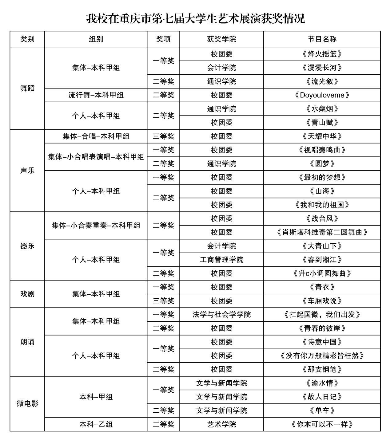 近日,重庆市第七届大学生艺术展演活动落下帷幕,并公布获奖名单。大学生艺术展演活动是重庆市规格最高、规模最大、影响最广的大学生艺术盛会,是高校践行美育育人、落实立德树人根本任务的重要途径。pp电子共获奖57项,其中一等奖作品16项、二等奖作品29项、三等奖作品12项,在获奖层级、获奖数量上均创历史佳绩。