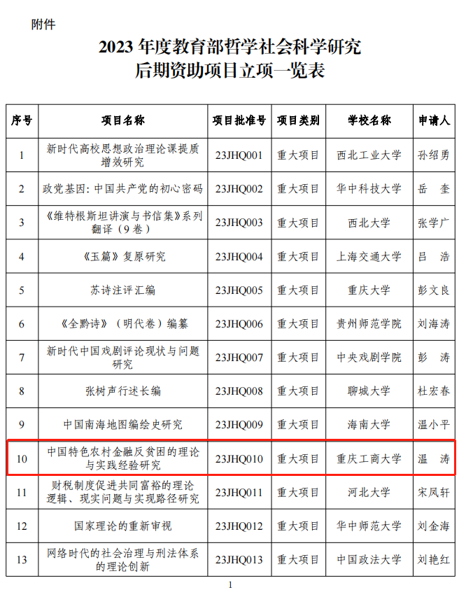 近日,教育部社科司公布了2023年度教育部哲学社会科学研究后期资助项目立项名单。pp电子温涛教授主持申报的项目“中国特色农村金融反贫困的理论与实践经验研究”获批为后期资助重大项目(项目批准号:23JHQ010)。这是pp电子首次获得该类重大项目立项。