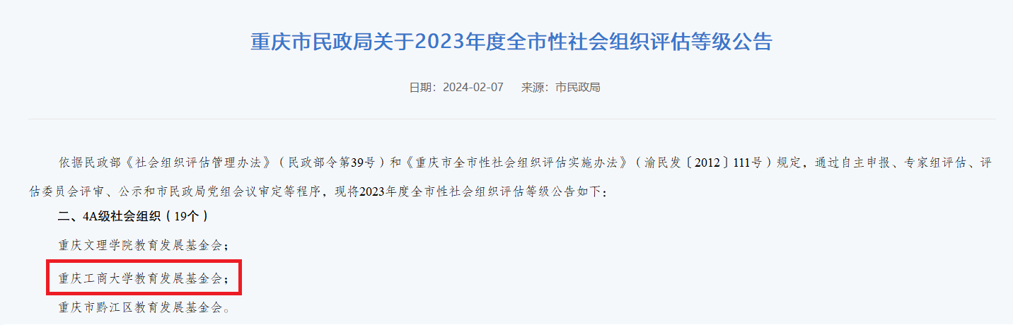 近日,重庆市民政局发布《重庆市全市性社会组织2023年评估等级结果公示》,pp电子基金会获评4A级社会组织。此次接受重庆市社会组织等级评估是pp电子基金会自成立以来首次。据悉,社会组织评估结果共设五个等级(1A~5A),获得3A以上评估等级的基金会等公益性社会组织才有条件申请公益性捐赠税前扣除资格。4A是重庆市民政局对社会组织评估新规则下首次迎评基金会能够获得的最高等级。