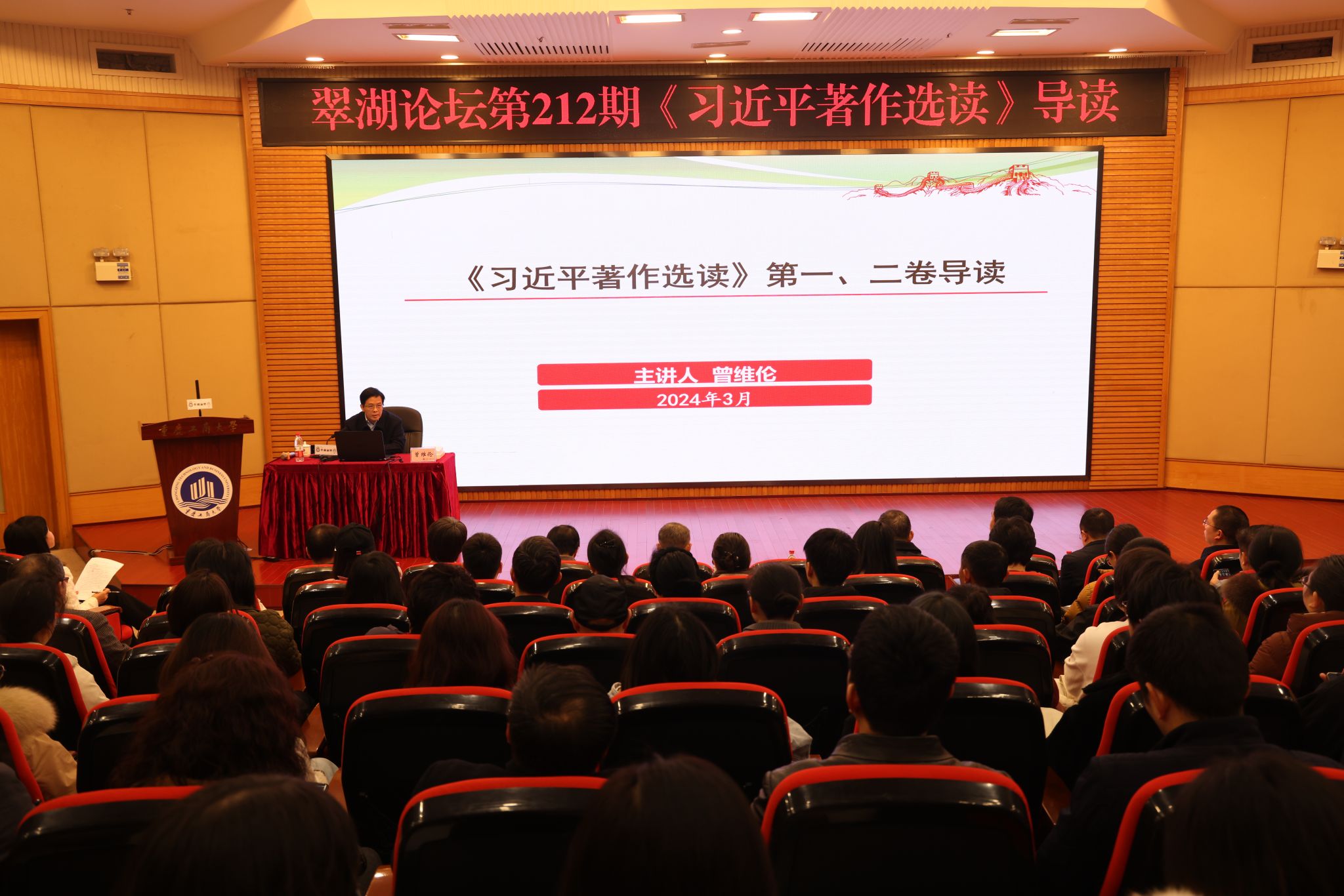 3月8日上午,pp电子在博智楼7200报告厅举办翠湖论坛第212期《习近平著作选读》导读讲座。翠湖论坛由学校图书馆主办,邀请了学校党委书记曾维伦作专题讲座。学校党委常委、副校长陈运超,相关职能部门负责人和师生代表250余人参加。