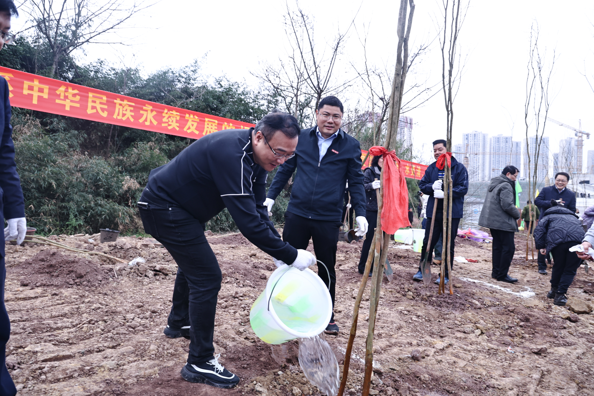 植树护绿功在当代,立德树人利在千秋。参加活动的校领导同校友、师生们一起投入到植树劳动中,大家相互配合,铲土造坑、培土围堰、踩土固苗、提水浇灌,现场气氛热烈,一派繁忙景象。