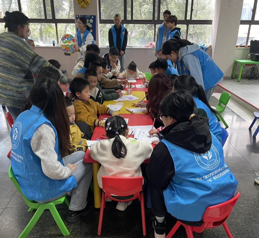 志愿者们以“一对一”形式和儿童做游戏、绘画创作和教唱儿歌。活动通过《粘泡泡糖》开场热身小游戏和绘画创作,锻炼儿童思维能力,让他们用画作表达奇思妙想。