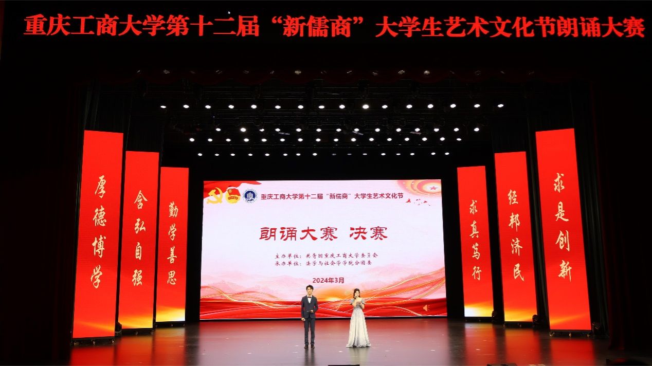 3月29日,由校团委主办、法学与社会学学院分团委承办的第十二届“新儒商”大学生艺术文化节朗诵大赛决赛在pp电子剧场举行。校党委书记曾维伦,党委常委、副校长李国军,校关工委副主任周航,校团委、法学与社会学学院的主要负责人以及900余名师生代表来到现场观看比赛。重庆市群众艺术馆文化活动部主任莫溦沙,全国社会艺术水平考级主持类朗诵类高级教师周黎,pp电子语言艺术团指导教师江蕊弘,重庆市语言文字工作委员会委员张彦,pp电子大学生艺术团指导教师王灿担任决赛评委。