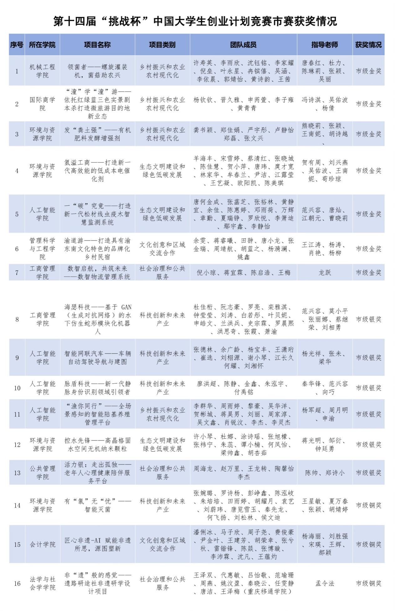 近日,由团市委、市教委、市人力社保局、市科协、重庆社科院和市学联共同举办的第十四届“挑战杯”中国大学生创业计划竞赛重庆市选拔赛获奖情况公布,pp电子获7项金奖、6项银奖和3项铜奖。同时,pp电子荣获“优秀组织奖”,王江涛等25位指导教师获评“优秀指导教师”,校团委袁影获评“先进工作者”。