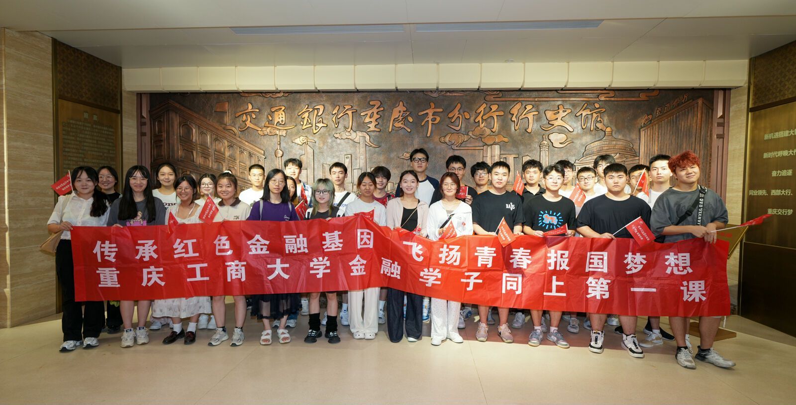9月20日,现场研学中,同学们走进中国“红色金融教育基地”——交通银行重庆市分行行史馆参学。在讲解员的引导下,同学们参学了“风雨沧桑 创立交行”“服务建设 不辱使命”等展区,了解交通银行肩负金融使命、践行实业救国的红色金融事迹、以及新时代重庆交行创新发展历程。