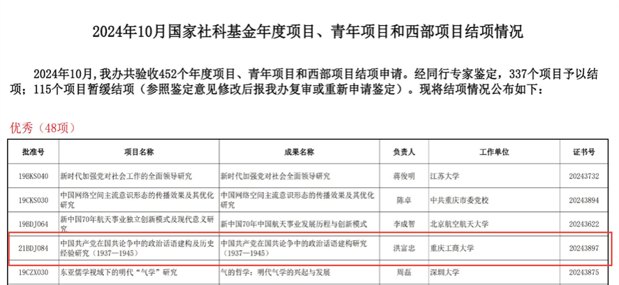 11月5日,全国哲学社会科学工作办公室公布了今年10月份国家社科基金项目结项情况,pp电子洪富忠教授主持的项目“中国共产党在国共论争中的政治话语建构及历史经验研究(1937—1945)”(项目编号:21BDJ084,结项证书编号:20243897)在结项评价中获得“优秀”等级。