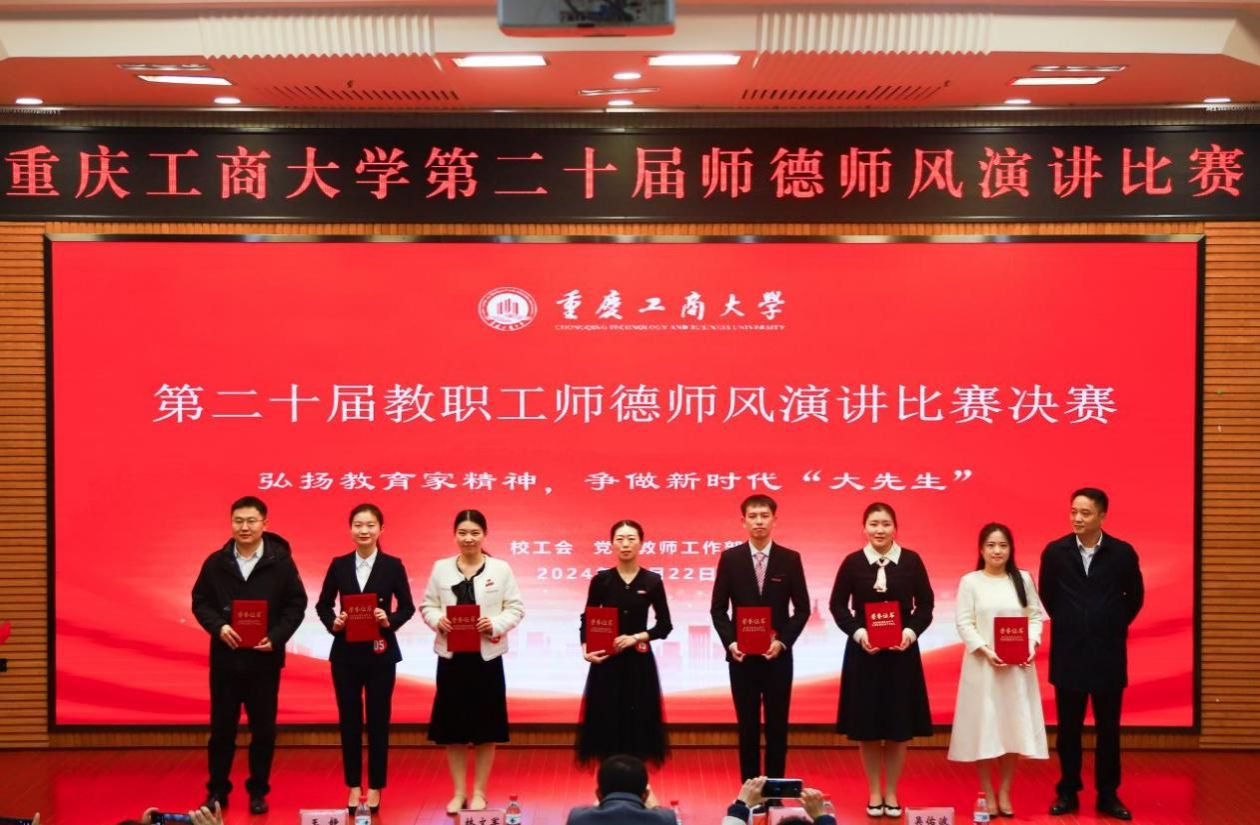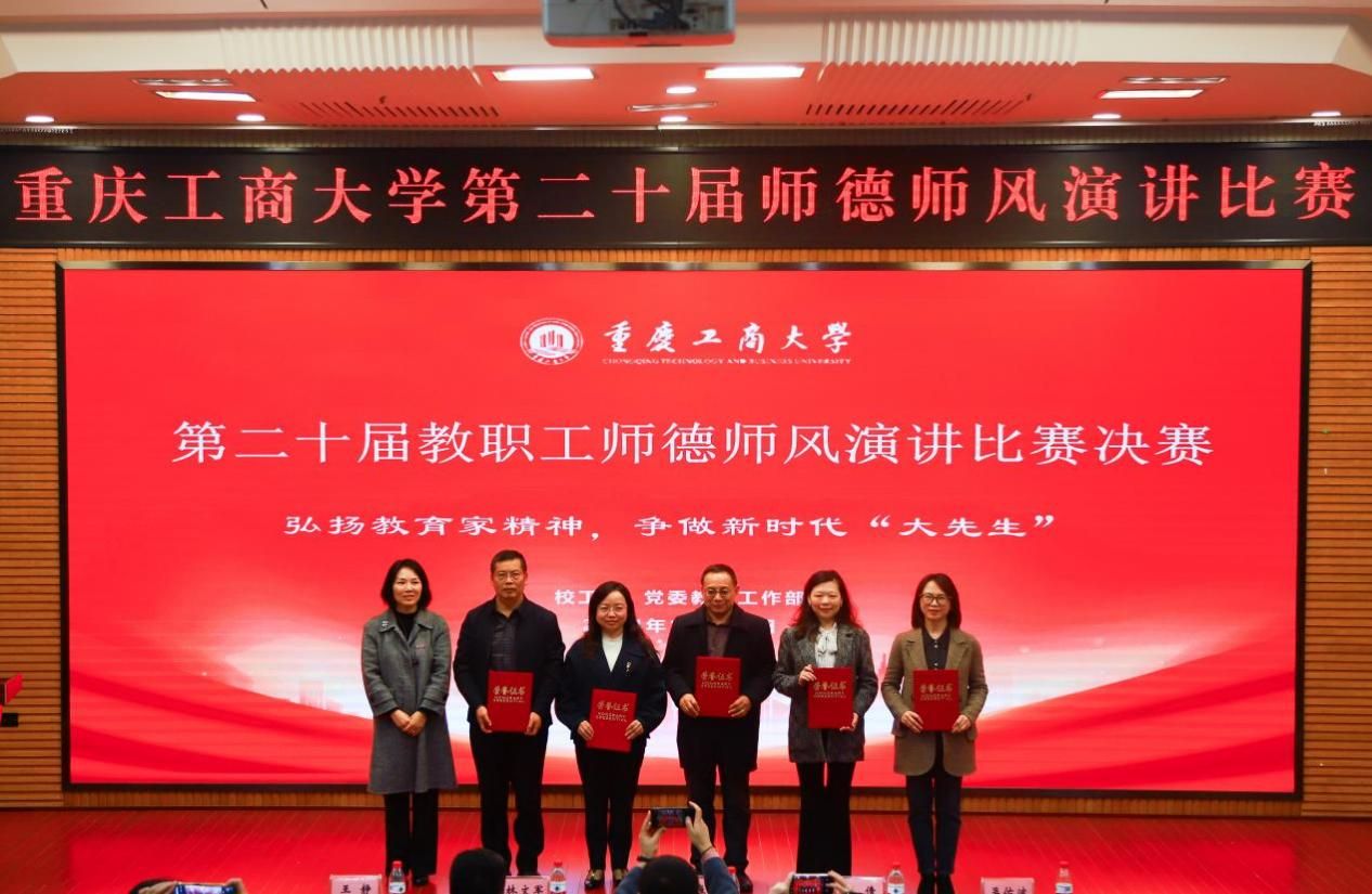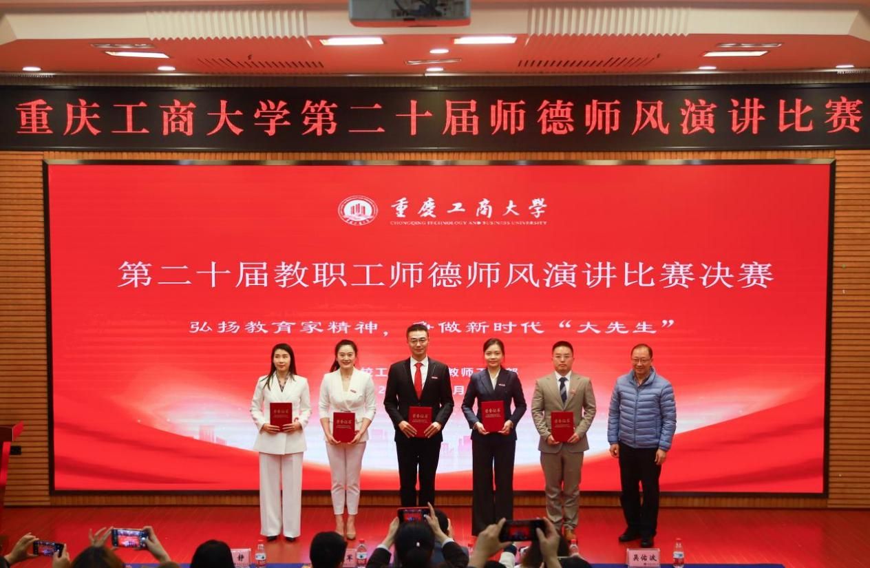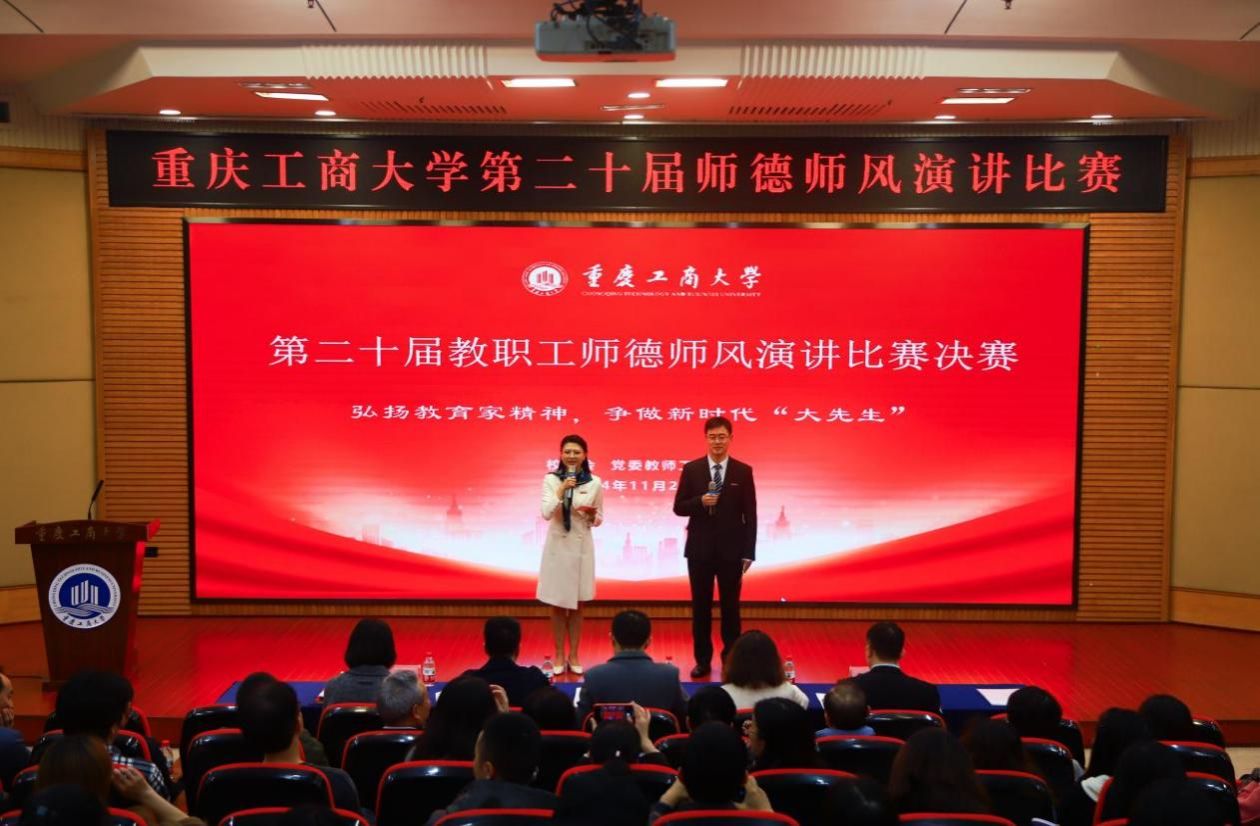 11月22日下午,由校工会、党委教师工作部联合举办的“立足新时代·当好主人翁·建功工商大”第二十届教职工师德师风演讲比赛决赛在博智楼7200学术报告厅举行。学校党委书记曾维伦,党委副书记、工会主席宋豫,党委常委、副校长张波、李国军,各学院党委/党总支书记、各部门工会主席以及教职工代表等观看了决赛。决赛邀请了重庆第二师范学院文学与传媒学院副教授魏巍,pp电子机关党委书记、组织部副部长杨倩,党委教师工作部部长、人事处处长林文军,工会常务副主席王静,团委书记吴佑波担任评委。