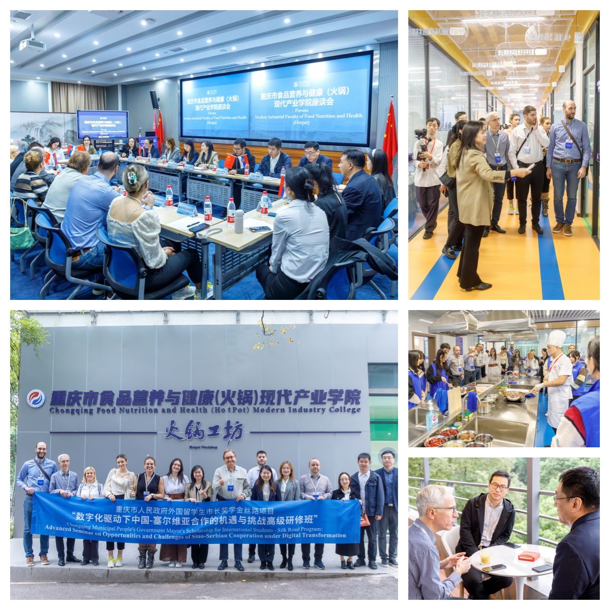 近日,重庆市食品营养与健康(火锅)现代产业学院分别迎来“数字化驱动下中国-塞尔维亚合作的机遇与挑战”高级研修班第一期、第二期成员。高级研修班成员由塞尔维亚高校、商会以及政府人员组成,双方就产业学院共建、人才培养合作、科技合作、重庆美食及文化等进行深入交流。食品科学与工程学院党委书记陈龙国、院长王星敏、副书记张薇薇、副院长尤琳烽以及学院教师代表参加了座谈与走访。