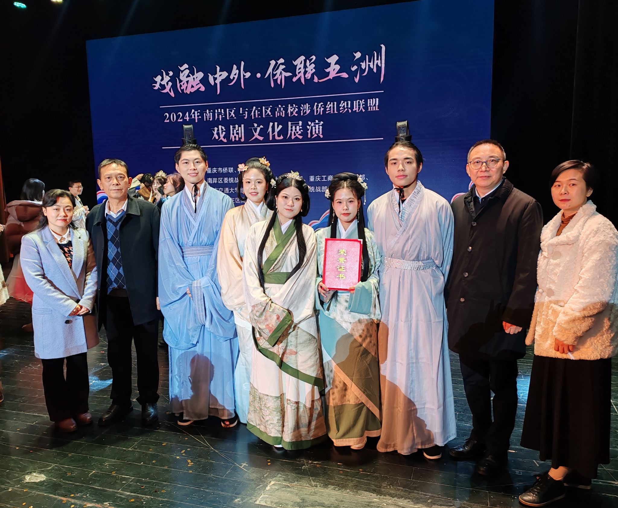 12月7日,南岸区与在区高校涉侨组织联盟“戏融中外·侨联五洲”戏剧文化展演活动在重庆邮电大学举行。中外学生以戏剧为载体开展中外文化交流,生动演绎中国梦。pp电子留学生院、外国语学院、国际商学院分别组织三个节目《郑人买履》《穿越古今,熔铸现代,引领未来》《新嫦娥奔月》参加展演,并获得二等奖。南岸区四所在区高校的师生及侨胞、侨属400余人观看了展演。