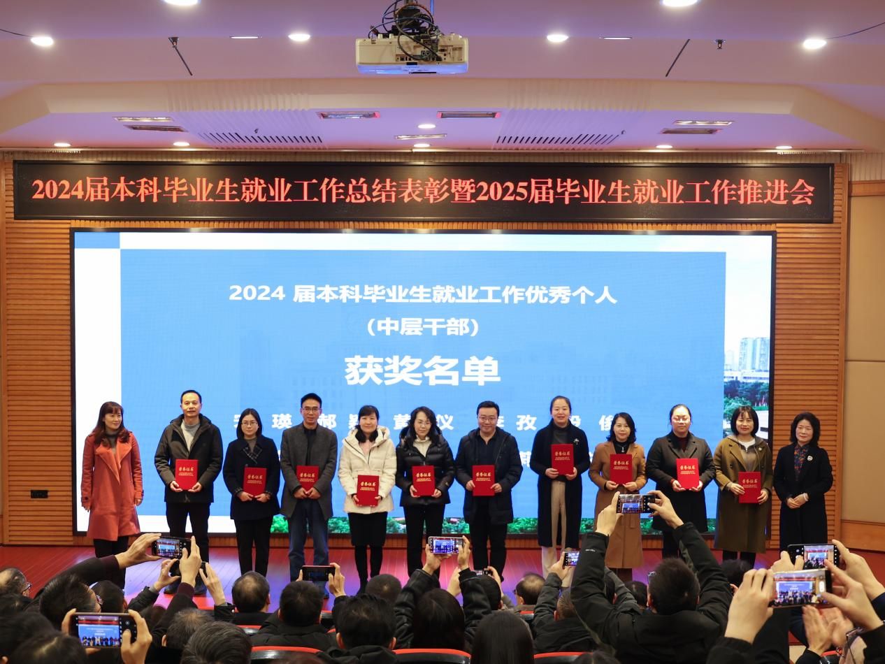 颁奖环节,李国军、柏群为获得“就业工作优秀个人”的毕业班辅导员、就业联络员颁奖,张波、杨柏为获得“就业工作优秀个人”的专任教师颁奖,宋豫、张海燕为获得“就业工作优秀个人”的中层干部颁奖,曾维伦为体育学院、金融学院、机械工程学院、工商管理学院、会计学院、经济学院6个获得“就业工作先进集体”的学院颁奖。
