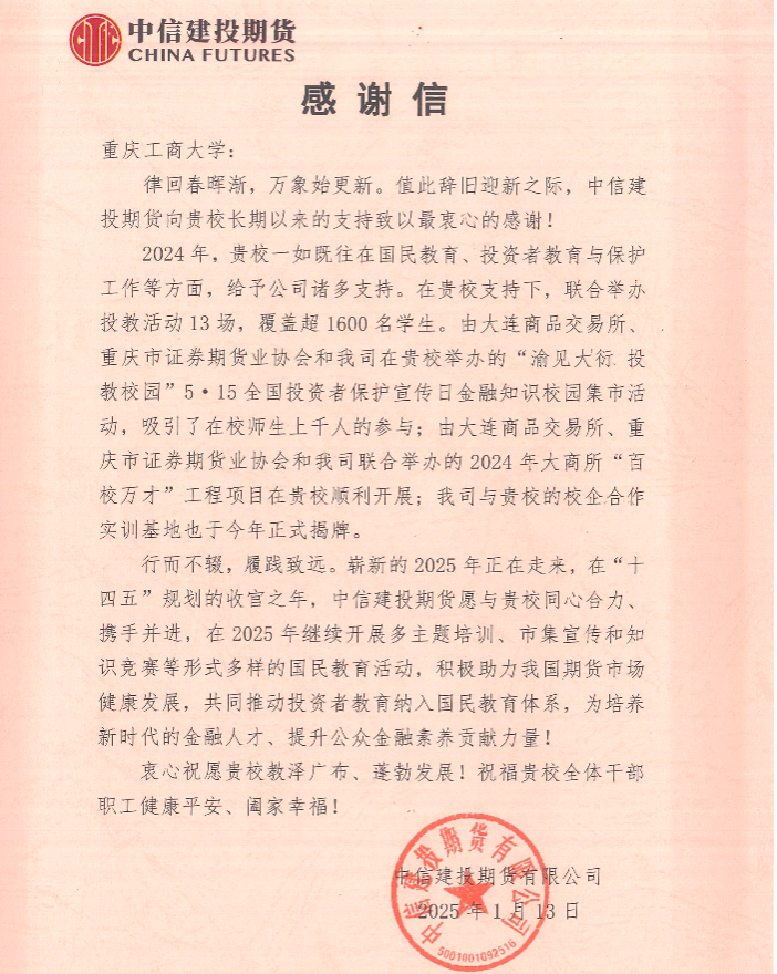 近日,pp电子会计学院收到来自中信建投期货有限公司的一封感谢信,信中对于学校在国民教育、投资者教育与保护工作等方面给予公司的支持表示感谢。