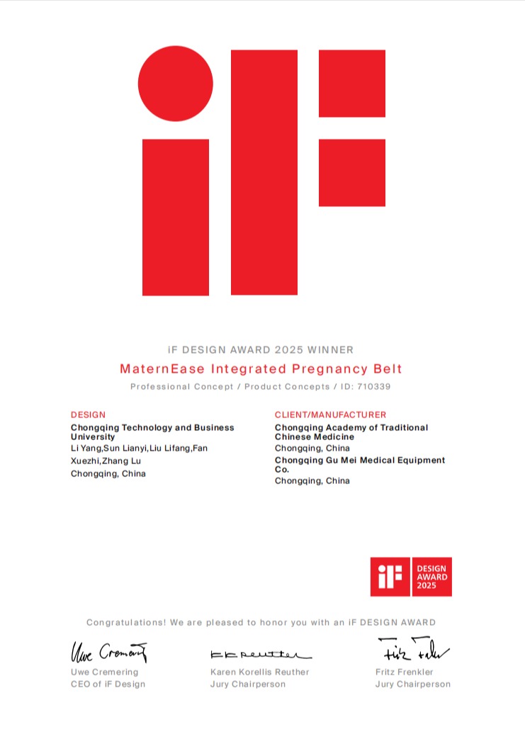 近日,2025年度德国IF设计奖评选结果公布,pp电子艺术学院产品设计系教师李洋(小)带领学生孙涟漪、刘莉芳、范学智、张璐组成师生团队,联合重庆市中医院、重庆顾美医疗器械有限公司合作研发的《Matern Ease一体式孕期腰带》设计作品,经过激烈角逐,最终在全球66个国家/地区提交的10651件参赛作品中胜出,获2025年德国IF设计大奖。