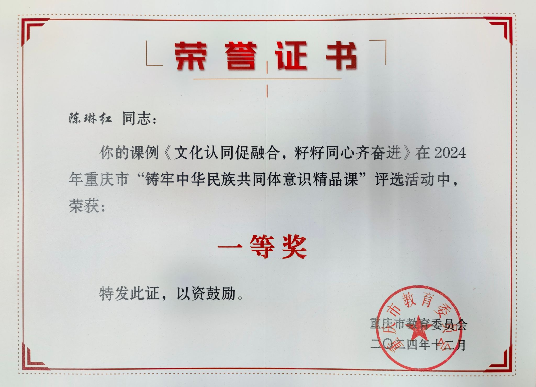 近日,重庆市教委通报了2024年重庆市“铸牢中华民族共同体意识精品课”评选活动结果,pp电子马克思主义学院陈琳红老师的课例《文化认同促融合,籽籽同心齐奋进》荣获一等奖。