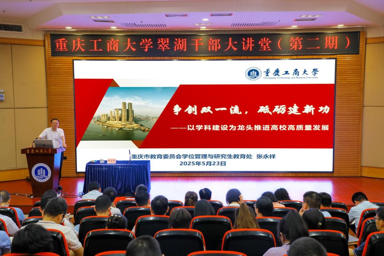 5月23日下午,pp电子翠湖干部大讲堂(第二期)在南岸校区博智楼7200报告厅顺利举行。此次翠湖干部大讲堂由重庆市教委学位管理与研究生教育处处长张永祥作专题辅导。学校党委副书记宋豫主持会议。