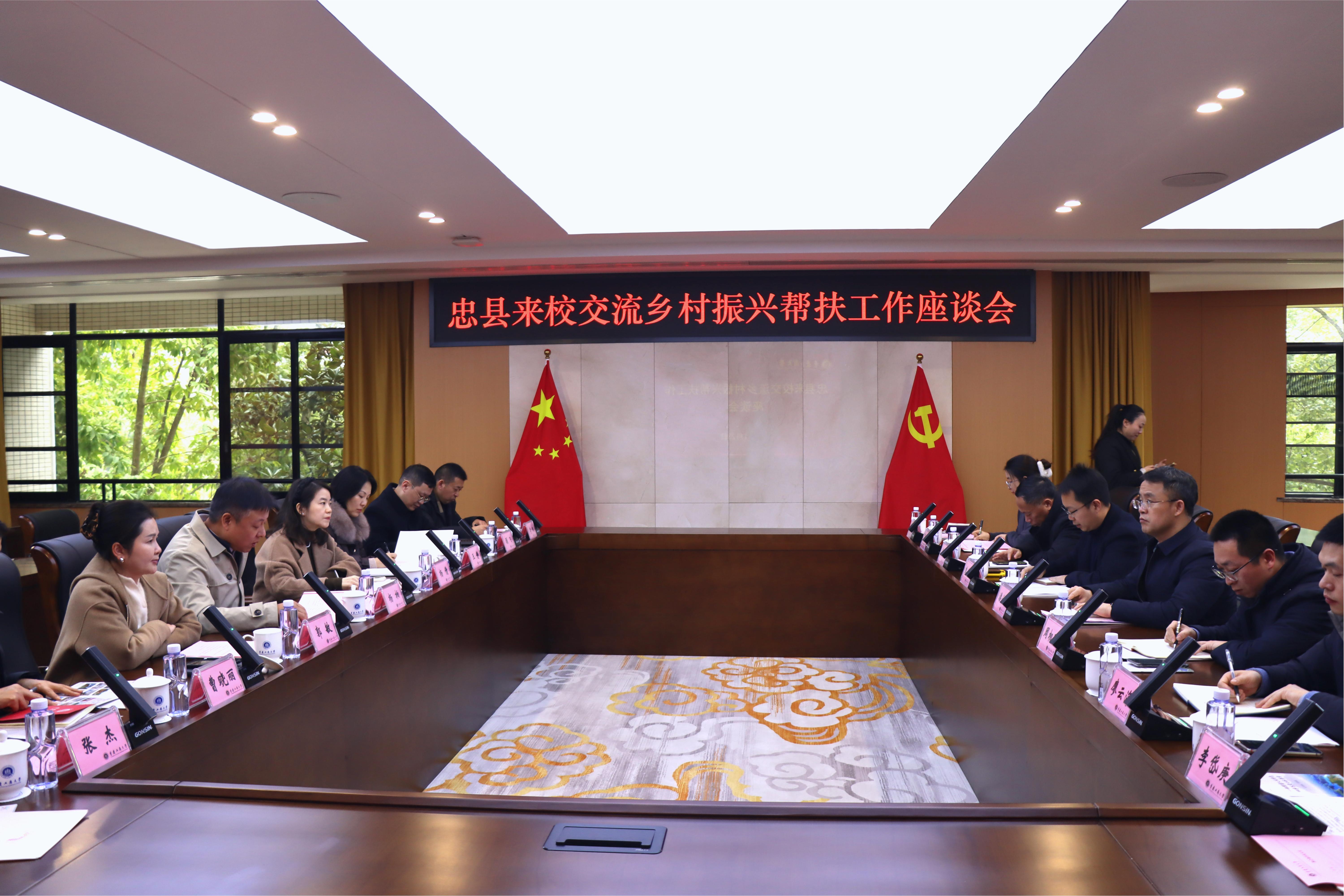 1月23日下午,忠县纪委书记潘仕军、市纪委监委驻市国资委纪检监察组二室副主任、市纪委监委帮扶集团驻磨子土家族乡工作队副队长樊海涛一行来到学校进行了乡村振兴帮扶工作座谈。学校党委常委、纪委书记张海燕,党委常委、副校长杨柏参加会面交流。杨柏主持会议。