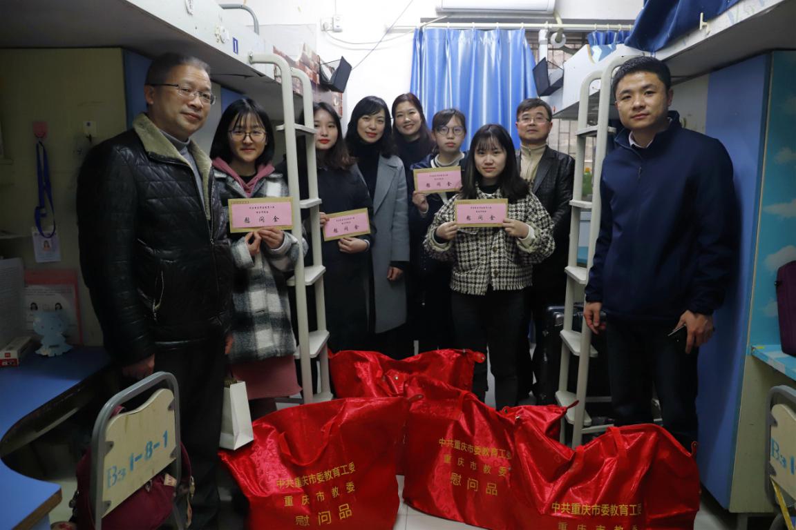 江燕副处长一行向pp电子部分留校学生赠送了慰问金及新春大礼包等慰问品并与大家合影留念。pp电子学生处相关负责同志陪同看望。