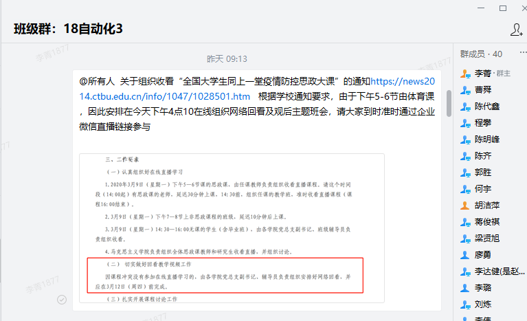学院提前通过教学群、班级群发布详细的收看攻略,同时统一组织学院全体党员干部、分散在全国各地的学生收看直播,对于不能参加在线直播学习的,另行组织回看教学视频,确保全院师生观看疫情防控思政大课。