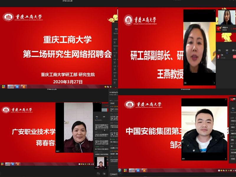 继pp电子研究生网络专场招聘系列活动启动以来,得到了用人单位与毕业研究生的一致好评。为持续推进pp电子毕业研究生就业精准帮扶工作深入开展,3月27日下午,第二场研究生网络专场招聘活动通过企业微信平台顺利举办。本场招聘会邀请到重庆德感科技创业投资有限公司、中国安能集团第三工程局、广安职业技术学院,三家单位为pp电子研究生量身定做提供了包含行政职能、财会审计、企业管理等40余个岗位。研工部副部长、研究生院副院长王燕教授、重庆德感科技创业投资有限公司董事长罗其胜先生、中国安能集团第三工程局人力资源部邹杰先生、广安职业技术学院办公室主任蒋春容老师参加了此次招聘会。