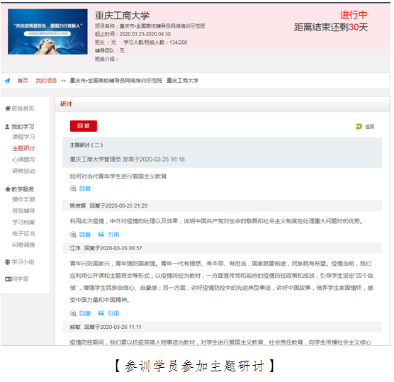 目前,全体参训人员正以认真的态度、饱满的热情投入培训学习。他们纷纷表示,在新冠肺炎疫情防控最关键时期,举办辅导员网络培训学习犹如一场“及时雨”正当其时,培训内容精彩纷呈、干货多多,为辅导员夯实信仰之基、补足精神之钙、把稳思想之舵,进一步做好新形势下学生思想政治教育工作注入了“强心剂”。现代国际设计艺术学院颜语老师说,将以此次培训为契机,深入学习贯彻习近平总书记关于疫情防控工作的重要讲话精神,充分认识疫情防控形势和应对策略,更好地引导青年学生理性认识和应对疫情带来的学习、生活和就业影响,增强学生爱党爱国爱校的思想情感,切实提升防疫工作能力和育人水平。会计学院王婷老师谈到,专家讲座不仅有樊富珉等教授讲授的压力舒缓实用技能,也有金灿荣等教授从国际视角看中国抗“疫”,为辅导员开展学生思政工作不仅提供了方法,还提供了方法论;管理学院聂树平老师表示,学习过程中可以通过“直播答疑”让老师在线实时和大咖互动,这样的云端学习,多屏同步,全学工队伍同进步,值得点赞!