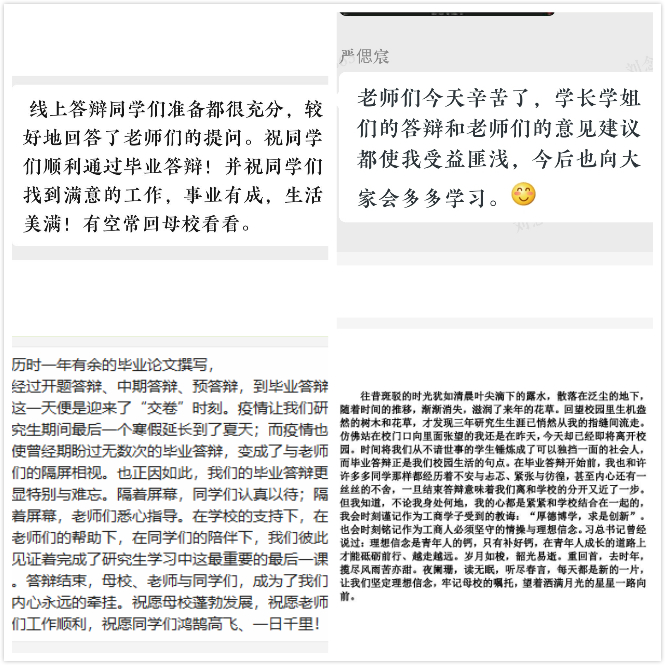 2020年是特殊的一年,2020届的毕业生也正在经历着一个特殊的毕业季。在疫情防控的特殊时期,远程视频答辩不仅能够充分利用信息化手段保证学位授予质量,还能适应当前时期特点,保障师生们的身体健康。师生们打破时空限制,在云端进行思想的碰撞和知识的交流,完成研究生期间的最后一课。对于2020届毕业生来说,线上答辩必然是一段难忘的经历和独特的体验。