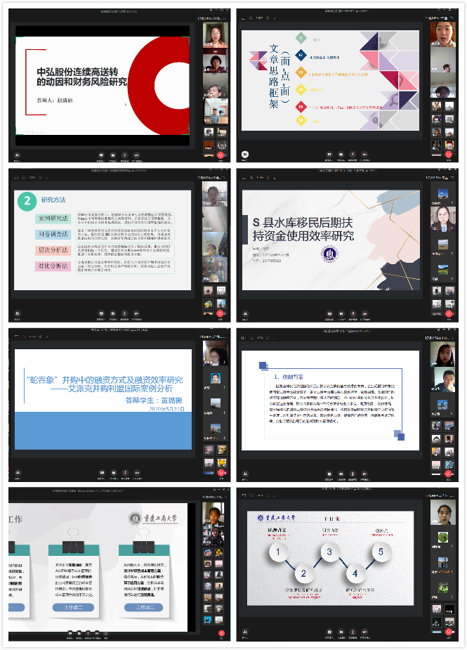 首先,宣布答辩规则。由答辩组长报告答辩委员会组成、答辩人情况、宣读答辩规则并宣布答辩开始。随后,学生陈述论文。同学们答辩准备认真充分,答辩PPT制作精美用心,在答辩过程中论述清晰、流畅。同学们的论文紧跟会计研究前沿热点,包括自然资产离任审计、财务共享、股权质押、环境审计、高送转、业绩承诺、内部控制、供应链金融、并购管理等方面。第三,答辩委员提问。答辩专家秉承严谨细致、认真负责的学术态度,认真倾听同时做好记录,在答辩人报告完毕后提出问题,并从论文的规范性、逻辑性、文献综述、论文边际贡献、案例研究方法、论文严谨性和创新性提出修改意见。答辩委员们所提出的问题发人深省,修改意见对于同学们的论文来说均是点睛之笔。第四,专家评分。所有同学陈述及回答完毕后退出会议室,答辩委员会委员对答辩过程与结果进行评议并进行线上评分。最后,答辩总结。各答辩人和观摩者重新进入会议室,由答辩组长对答辩情况进行总结并宣布答辩结束。两天的远程视频答辩在紧张严肃的氛围下圆满结束。