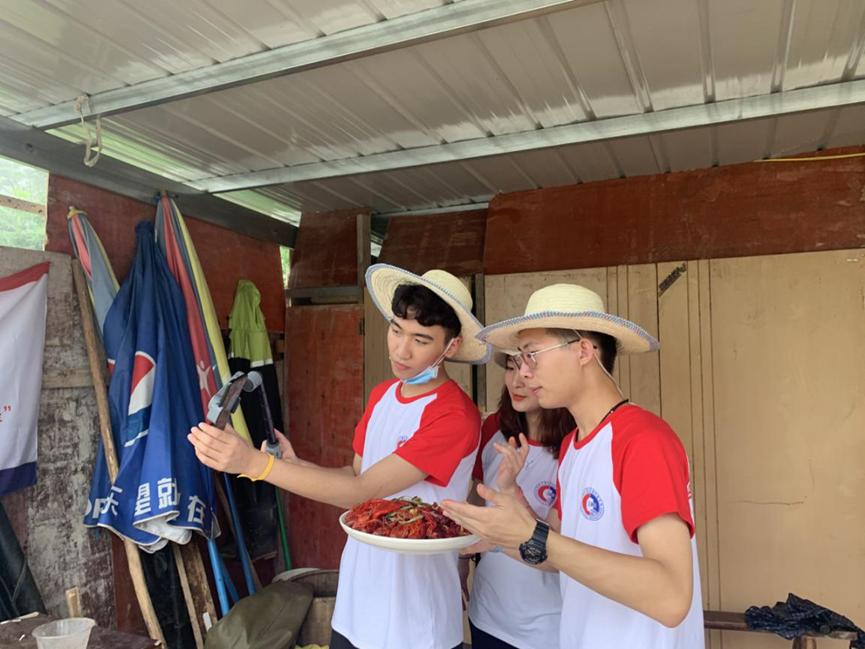 实践团小分队正在直播带货小龙虾
