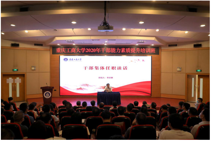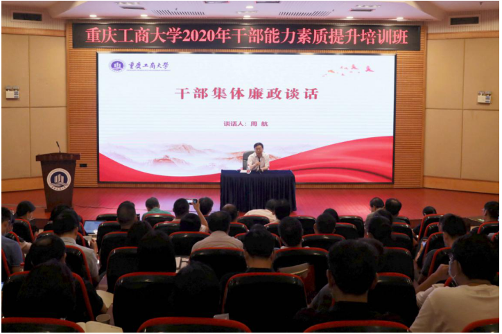 8月31日上午,学校在博智楼7200学术报告厅继续举行干部能力素质提升培训。校党委常委、纪委书记、市监委驻pp电子平台官网入口监察专员周航作了干部集体廉政谈话。校党委书记李志雄作了干部集体任职谈话。培训班全体成员参加了谈话。会议由校党委副书记宋豫主持。