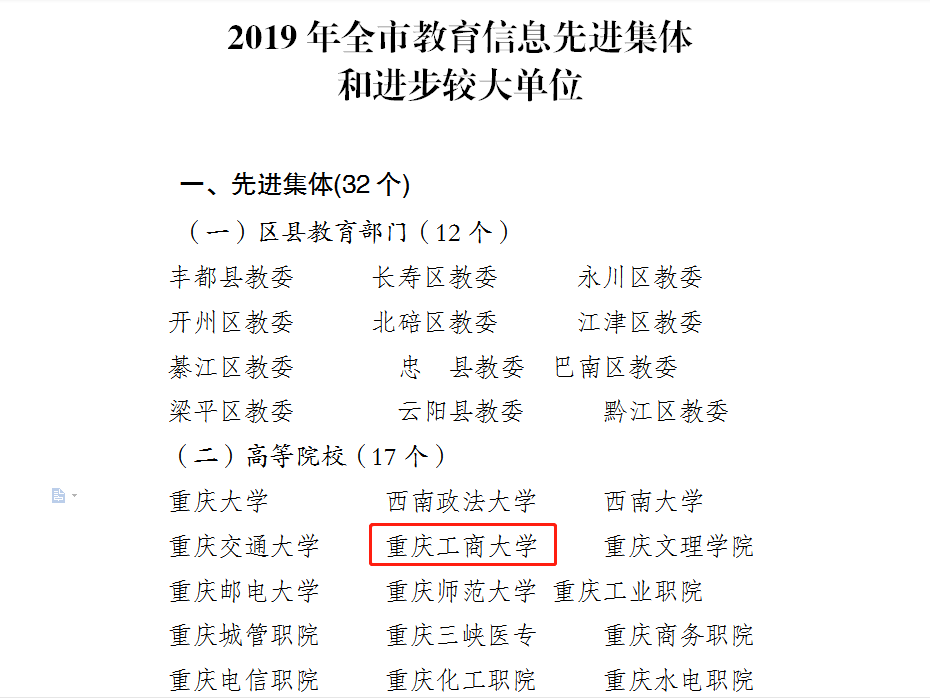 日前,重庆市教育委员会办公室公布了《关于2019年教育信息工作情况的通报》,pp电子被评为2019年全市教育信息工作先进集体,胥炜同志被评为全市教育信息工作先进个人。