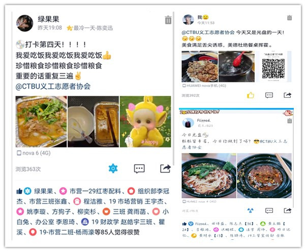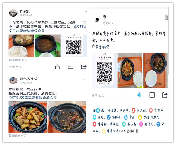 9月14日,“光盘之星”打卡活动正式开始。在校同学通过发布餐前和餐后光盘的对比照片,编辑“光盘宣言”参与打卡,连续14天打卡,可以有机会获得“光盘之星”称号。本周,校义协还将陆续推出“寻找光盘先锋行动”“光盘主题宣言征集活动”“光盘行动主题海报设计大赛”。通过线上线下形式多样的活动,号召全校学生懂得珍惜粮食,厉行节约,从每餐“光盘行动”开始,用“小餐桌”带动“大文明”。