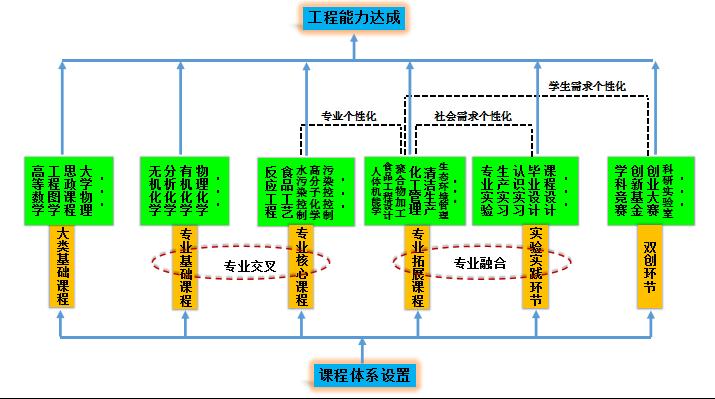 以企业需求为导向,优化工程人才培养方案,重构专业交叉融合的课程体系,在6个专业基础课模块中打通设置《无机及分析化学》、《有机化学》、《物理化学》等课程。专业课程中强化技术经济和工程伦理,建立“学生为中心、项目为抓手、平台为依托、制度为保障"的工程人才培养模式,侧重工程实践能力培养,提升学生解决复杂工程问题的能力。