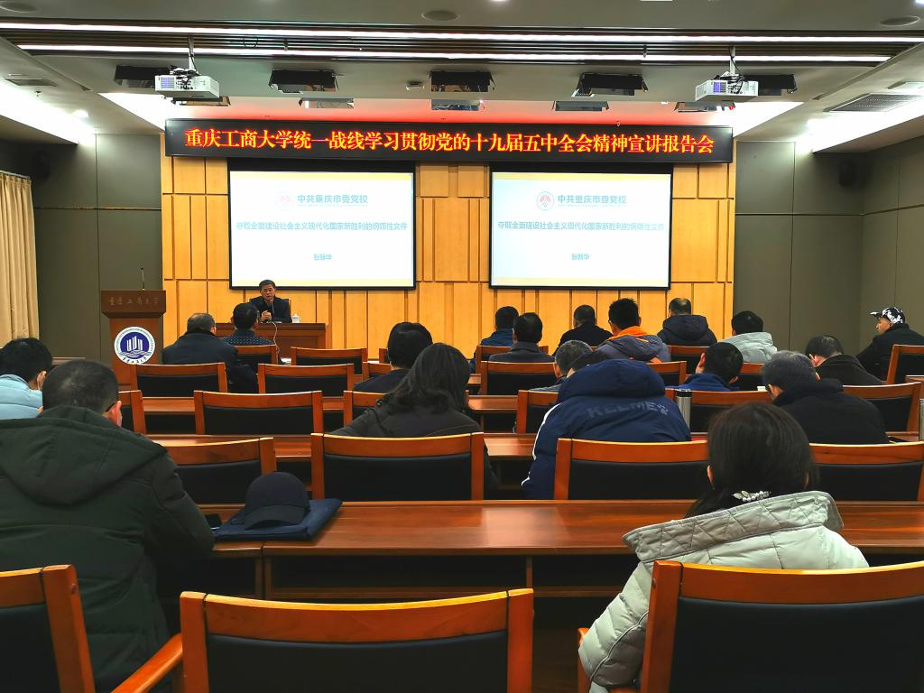按照《pp电子平台官网入口学习宣传贯彻党的十九届五中全会精神工作方案》(重工商大委【2020】97号)相关要求,12月17日下午,学校在新图书馆会议中心一会议室举办统一战线学习贯彻党的十九届五中全会精神宣讲报告会,邀请中共重庆市委党校(重庆行政学院)张新华教授作宣讲报告。学校党委统战部常务副部长陈松主持宣讲报告会。学校非中共党员的市、区人大代表、政协委员,民主党派市委委员、区委主委(副主委),各民主党派基层组织和统战团体的领导班子、成员代表以及党委统战部干部,共计60余人参加了报告会。