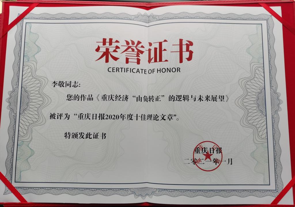 李敬教授的理论文章《重庆经济“由负转正”的逻辑与未来展望》紧跟热点,突出重庆经济增速“由负转正”这一主题,分析重庆经济“由负转正”的逻辑,展望重庆经济未来发展,具有较强的理论意义和实践价值,刊发后社会反响较好,入选“重庆日报2020年度十佳理论文章”。易淼教授获评“重庆日报2020年度十佳理论作者”。座谈会上,李保海和曾维伦先后为“十佳理论文章”的作者和“十佳理论作者”颁奖。