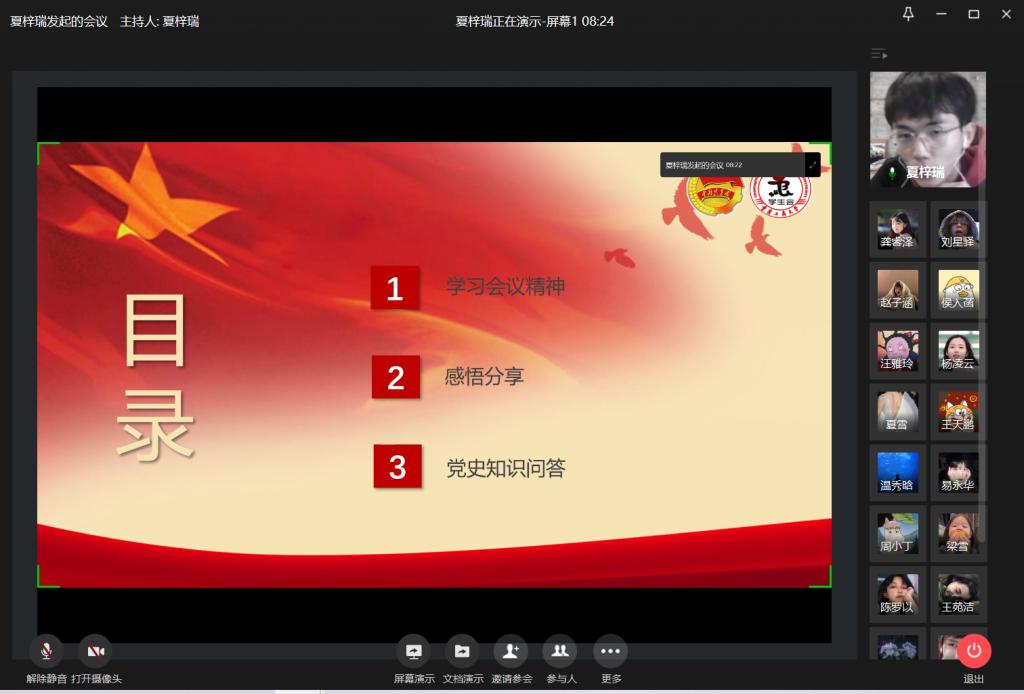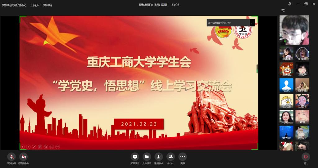 为学习习近平总书记在党史学习教育动员大会上的重要讲话,pp电子学生会于2月23日通过企业微信平台开展“学党史,悟思想”线上学习交流会。本次线上主题学习交流会由校学生会主席团成员夏梓瑞主持,20余名学生会成员线上共同参与。