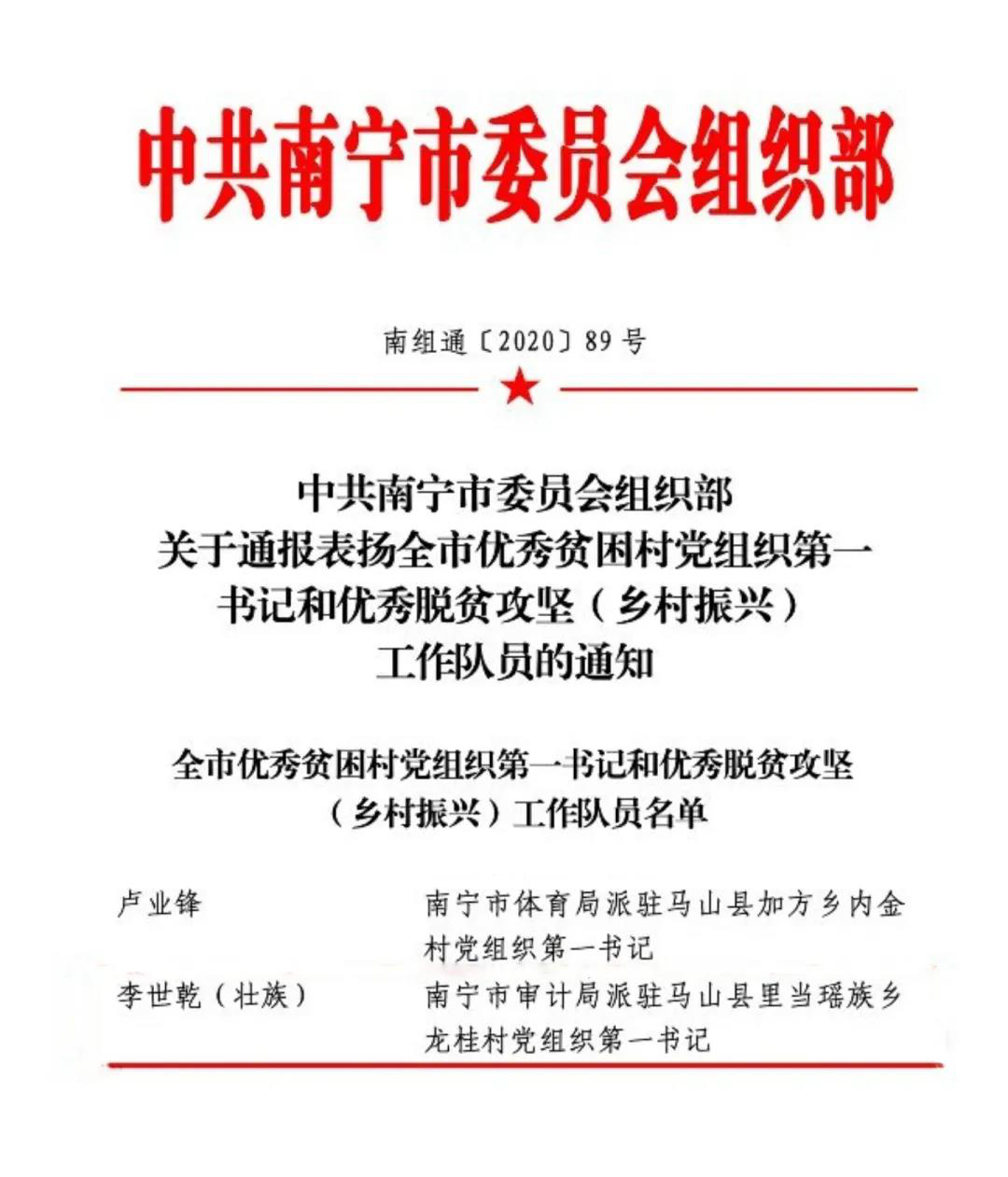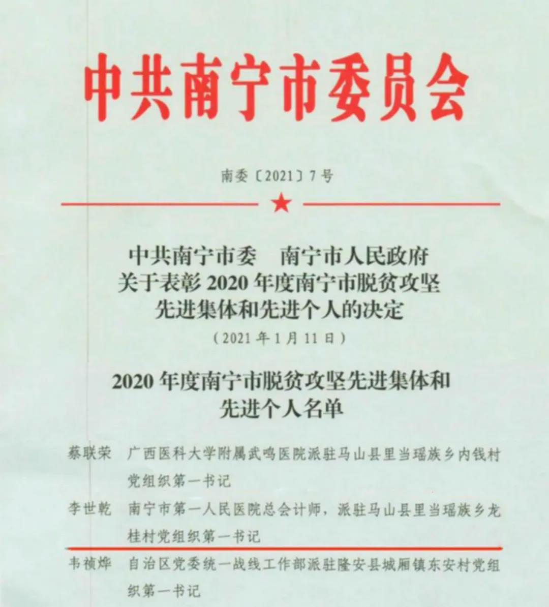 李世乾的辛勤付出得到了组织的认可与表彰,荣获“南宁市优秀贫困村党组织第一书记”、“南宁市脱贫攻坚先进个人”称号。
