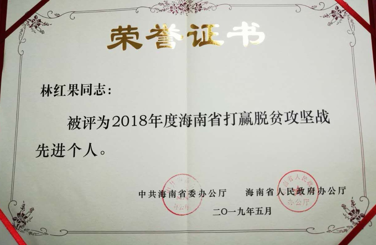 林红果驻村以来,群众满意度和获得感不断提高,得到了群众和组织的肯定,先后荣获“海南省五指山市优秀驻村第一书记”、“海南省五指山市第二届五指山好人敬业奉献奖”、“海南省打赢脱贫攻坚战先进个人”、“海南省五指山市优秀脱贫攻坚战斗中队中队长”等荣誉称号。