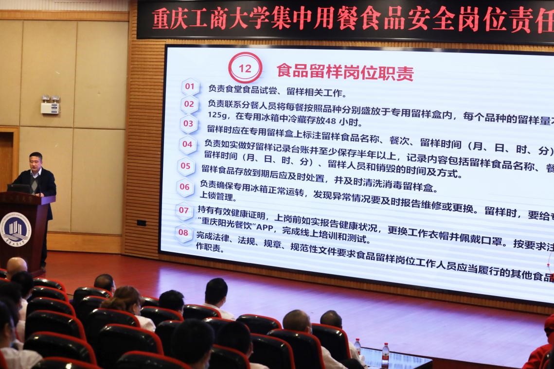 为保障学校师生食品安全,健全食品安全管理制度,明确食品安全工作责任,加强食品安全管理,根据《重庆市市场监督管理局 重庆市教育委员会关于建立学校及幼儿园集中用餐食品安全岗位责任制度的通知》(渝市监发〔2021〕14号)要求,pp电子于3月8日召开校长办公会,讨论通过了《pp电子平台官网入口集中用餐食品安全岗位责任制度》,将上级部门对校园食品安全要求进行细化、分解,明确从校长到一般食品安全从业人员等相关责任人员的食品安全工作任务;对校园食品安全主体责任、第一责任、主要责任、直接责任等进行清晰地界定,确保做到责任落地、落实。3月19日下午,pp电子在博智楼7200报告厅召开培训会,后勤处处长沙云对《pp电子平台官网入口集中用餐食品安全岗位责任制度》逐条、逐项并结合案例进行培训讲解,要求每个岗位做到人人知晓、责任清楚、任务明确。后勤处饮食科,校内各餐饮公司负责人、幼儿园负责人、各食堂经理、各食堂班组骨干人员等200余人参加了培训会。