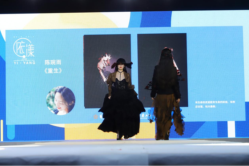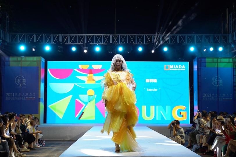 华灯璀璨,霓裳丽影。随着主持人宣布开场,模特们依次登台,动态展示了艺术学院与现代国际设计艺术学院2021届毕业学子170余件优秀毕业作品。本次服装秀分为上下两场,主题为“依.漾”。艺术学院与现代国际设计艺术学院的学子们以其前卫的审美、独特的视角,从结构、色彩、面料等多个层面进行精心设计、打版制作,将时尚、流行、自然、民族传统等多种元素融入设计之中,表现出了独特、创意、风格多元的设计理念。学子们在一针一线中注入了匠心之魂,将创意的灵感赋予在作品中,独立思考、协同合作,达到美育育人的效果。