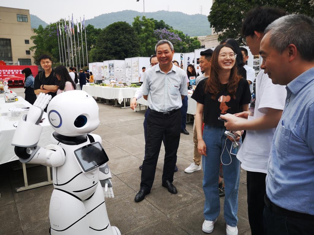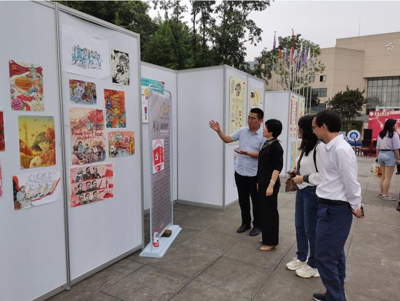 在课说党史展区,宋豫仔细观看了艺术学院专业教师指导学生将党史学习教育有机融入艺术专业课程所创作的创意设计作品,并对如何深入推进课说党史活动、做好日常课程思政建设进行了指导。在机械工程作品展区,李国军向学生详细了解了作品的设计理念和功能原理,与人工智能学院学生团队的智能AI机器人进行了亲切的互动,他鼓励学生们在校学习期间继续开展美育创新。在手绘工商大展区,柏群认真地阅览了一幅幅生动形象的校园手绘作品,肯定了艺术学子用画笔表达对校园的热爱之情。