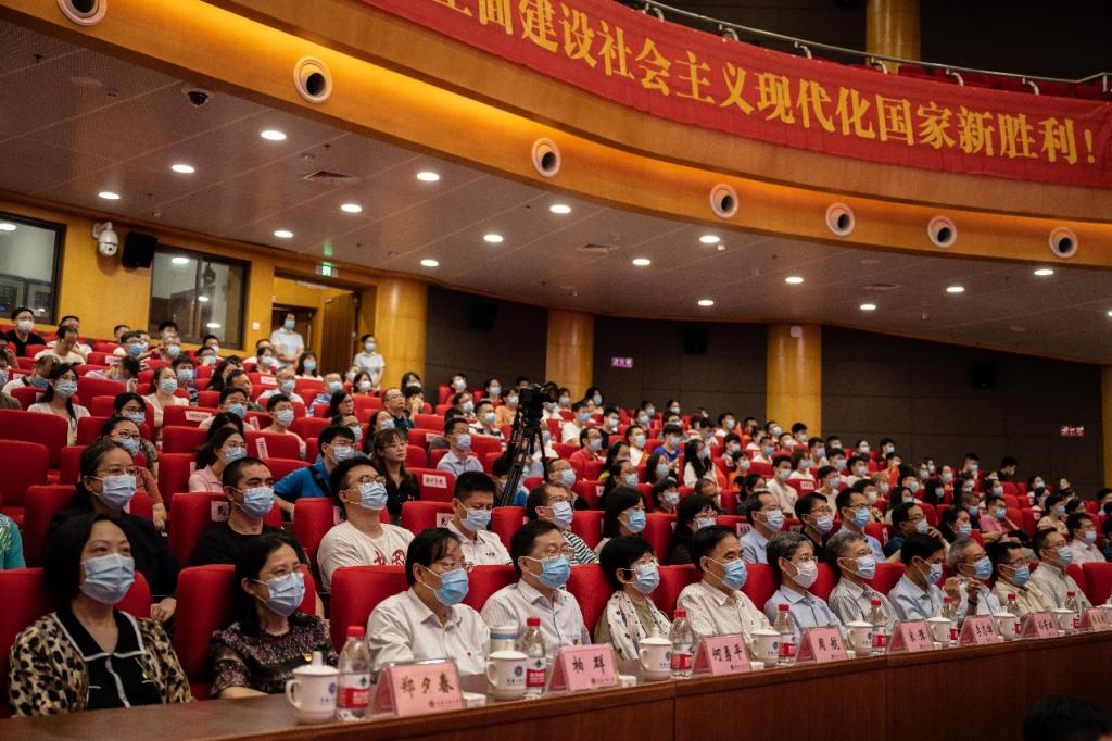 报告厅内,全体党员师生佩戴党徽,心潮澎湃地观看直播,场内不时响起阵阵掌声,气氛热烈。